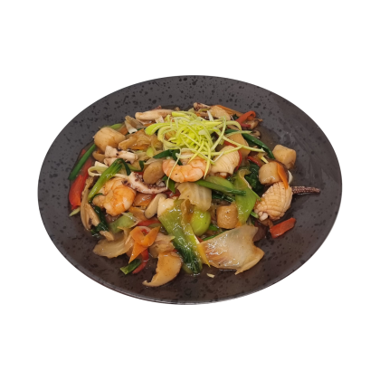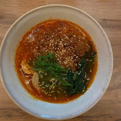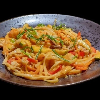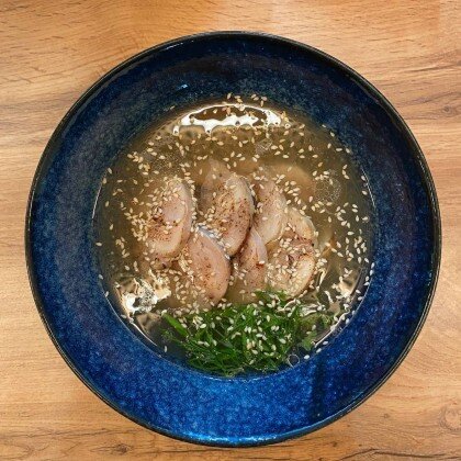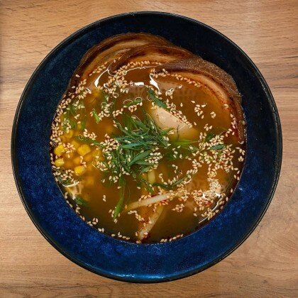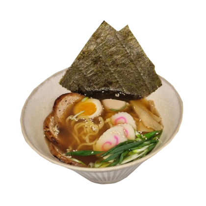 Лапша рамен, свинина, лук, морковь, грибы, менма, капуста, лук зеленый, имбирь, соус якинику.