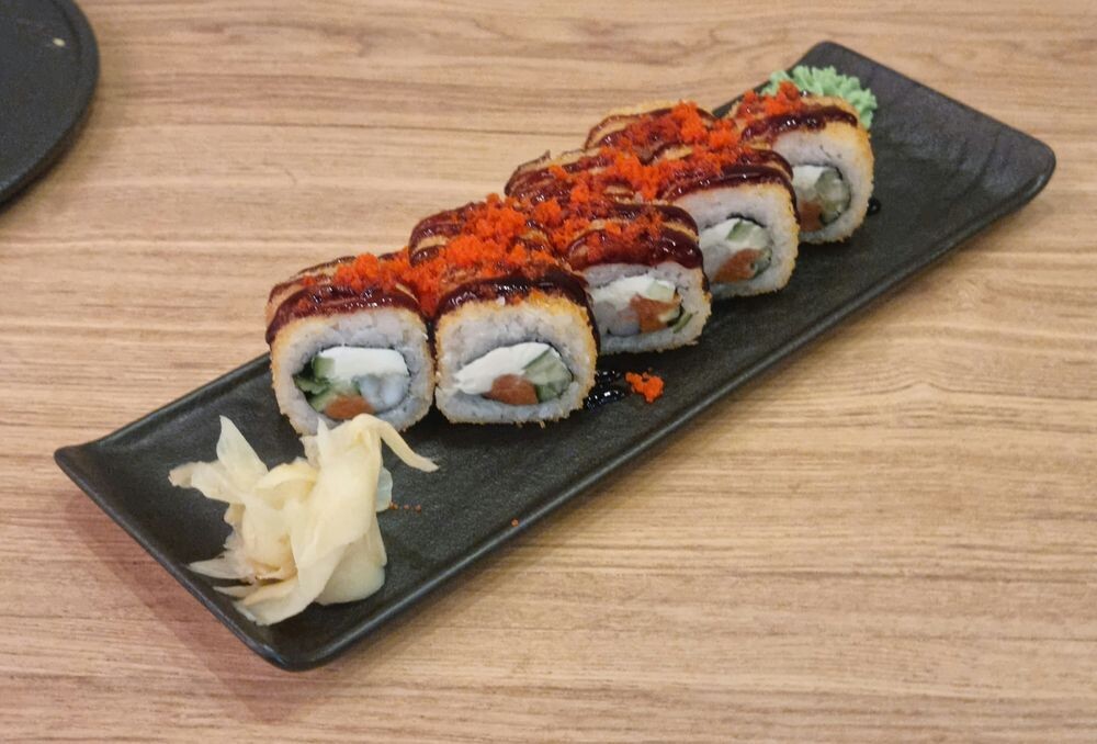 Рис, нори, лосось, сыр творожный, креветка, огурец,, соус унаги. тобико