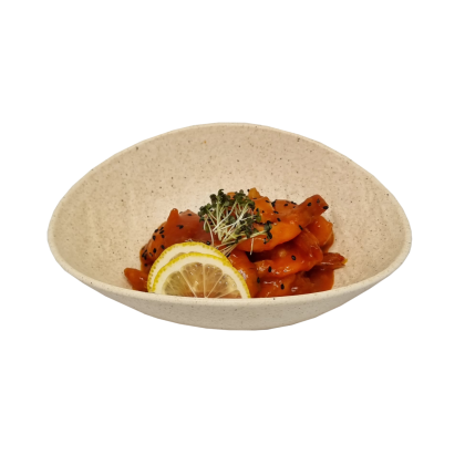 Палтус, лосось, овощи, стружка тунца, лимон, соус.
